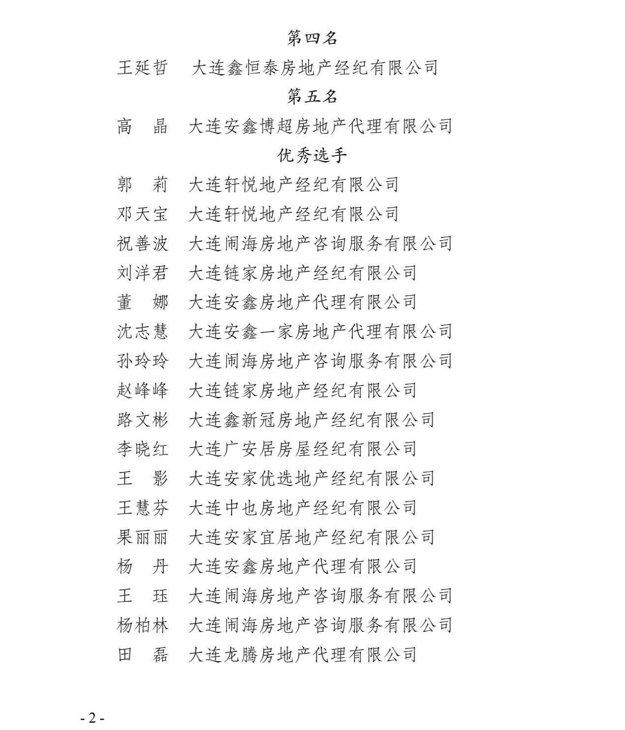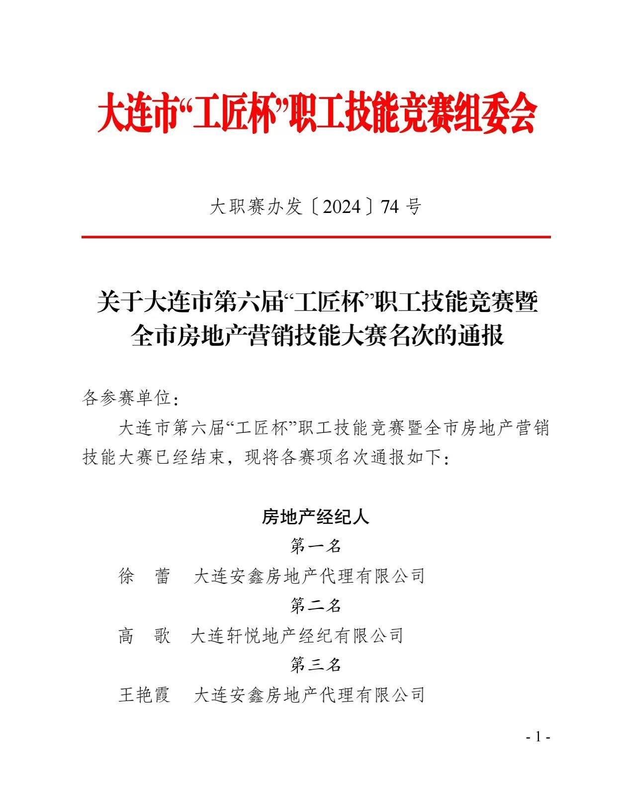 您现在的位置: 首页>>行业动态正文通知公告 转发 |《关于大连市第六届“工匠杯”职工技能竞赛暨全市房地产营销技能大赛名次的通报》 发布时间: 2025/05/26 11:35:37编辑:大连市房地产估价师与经纪人协会点击:461 附件:竞赛成绩单(附件)